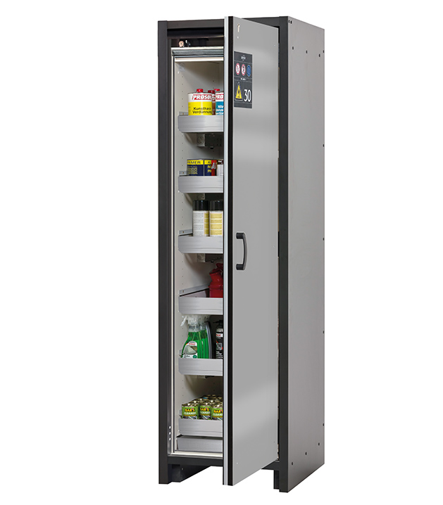 Korpusfarbe Anthrazitgrau, mit Flügeltür in asecos Silber, Inneneinrichtung mit 6 x Auszugswanne (Edelstahl 1.4301), 1 x Bodenauffangwanne (Edelstahl 1.4016)