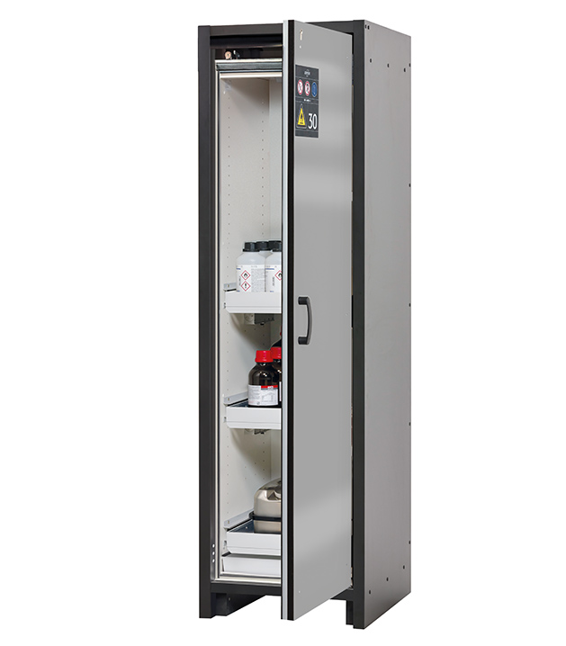 Korpusfarbe Anthrazitgrau, mit Flügeltür in asecos Silber, Inneneinrichtung mit 3 x Auszugswanne, 1 x Bodenauffangwanne (Stahlblech pulverbeschichtet)