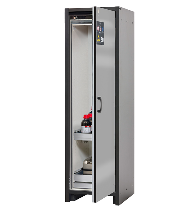 Korpusfarbe Anthrazitgrau, mit Flügeltür in asecos Silber, Inneneinrichtung mit 2 x Auszugswanne (Edelstahl 1.4301), 1 x Bodenauffangwanne (Edelstahl 1.4016)