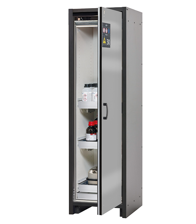 Korpusfarbe Anthrazitgrau, mit Flügeltür in asecos Silber, Inneneinrichtung mit 3 x Auszugswanne (Edelstahl 1.4301), 1 x Bodenauffangwanne (Edelstahl 1.4016)