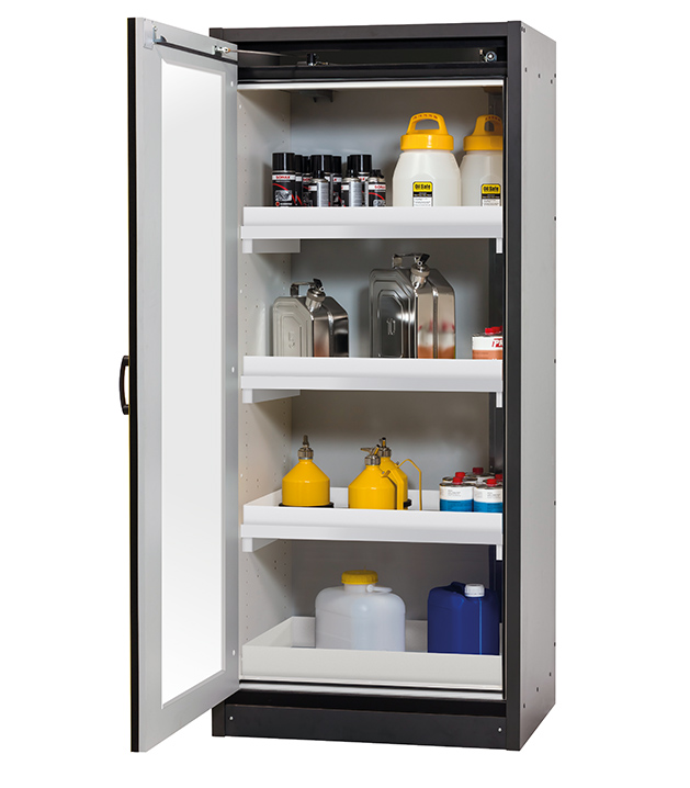 Korpusfarbe Anthrazitgrau, mit Flügeltür mit Glasausschnitt in Sicherheitsgelb (RAL 1004), Inneneinrichtung mit 3 x Wannenboden, 1 x Bodenauffangwanne (PP)