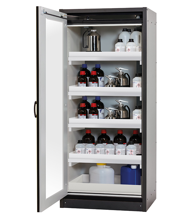 Korpusfarbe Anthrazitgrau, mit Flügeltür mit Glasausschnitt in Sicherheitsgelb (RAL 1004), Inneneinrichtung mit 4 x Wannenboden, 1 x Bodenauffangwanne (PP)
