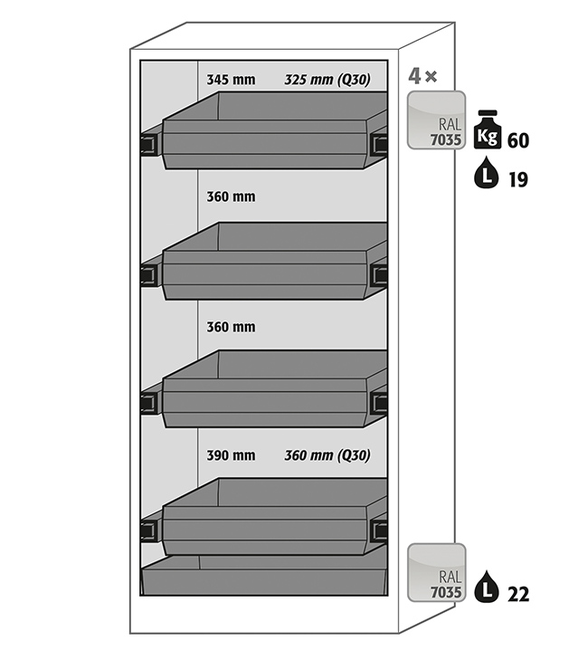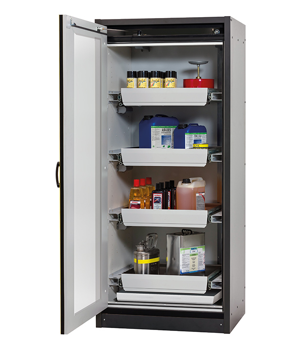Korpusfarbe Anthrazitgrau, mit Flügeltür mit Glasausschnitt in Sicherheitsgelb (RAL 1004), Inneneinrichtung mit 4 x Auszugswanne, 1 x Bodenauffangwanne (Stahlblech pulverbeschichtet)