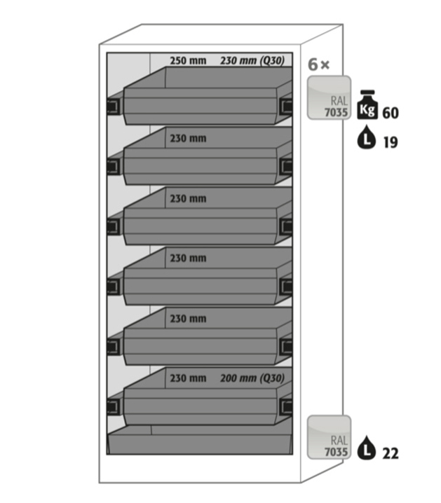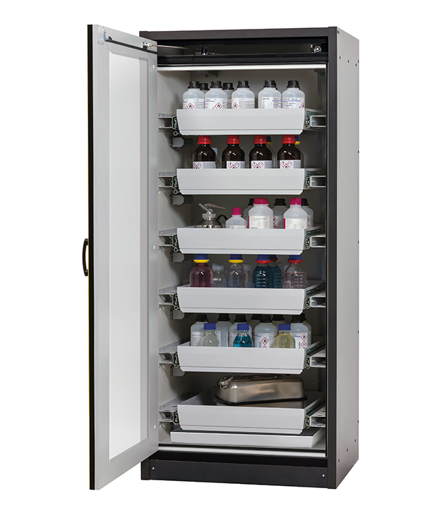 Korpusfarbe Anthrazitgrau, mit Flügeltür mit Glasausschnitt in Sicherheitsgelb (RAL 1004), Inneneinrichtung mit 6 x Auszugswanne, 1 x Bodenauffangwanne (Stahlblech pulverbeschichtet)
