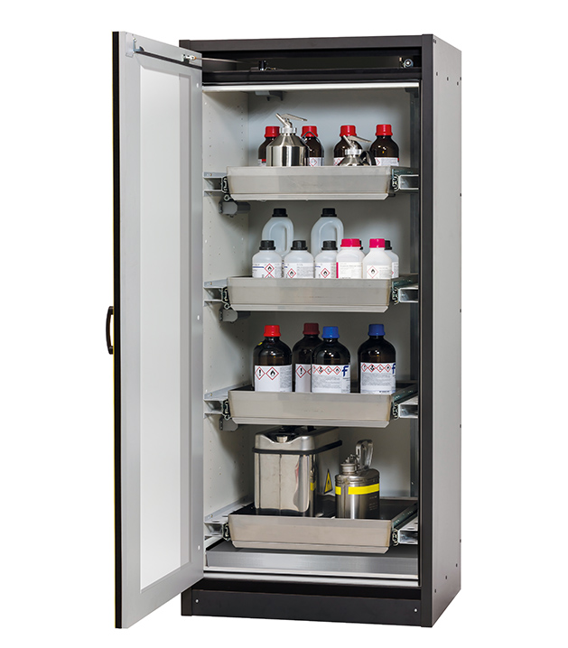 Korpusfarbe Anthrazitgrau, mit Flügeltür mit Glasausschnitt in Sicherheitsgelb (RAL 1004), Inneneinrichtung mit 4 x Auszugswanne, 1 x Bodenauffangwanne (Edelstahl 1.4301)