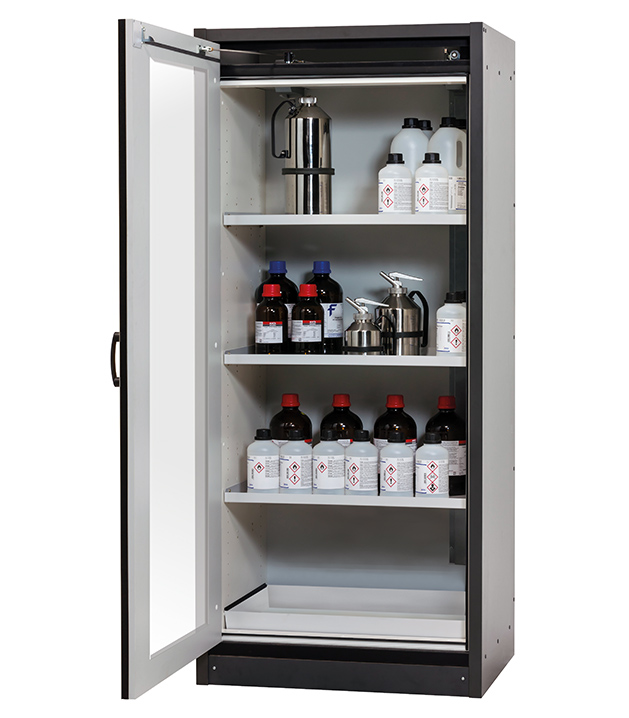 Korpusfarbe Anthrazitgrau, mit Flügeltür mit Glasausschnitt in Lichtgrau (RAL 7035), Inneneinrichtung mit 3 x Fachboden, 1 x Bodenauffangwanne (Stahlblech pulverbeschichtet)