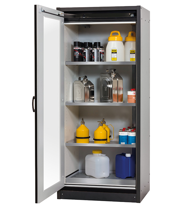 Korpusfarbe Anthrazitgrau, mit Flügeltür mit Glasausschnitt in Lichtgrau (RAL 7035), Inneneinrichtung mit 3 x Fachboden (Edelstahl 1.4301), 1 x Lochblecheinsatz (Edelstahl 1.4016), 1 x Bodenauffangwanne (Edelstahl 1.4301)