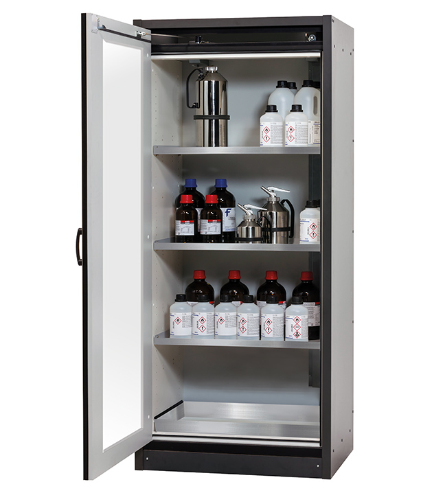Korpusfarbe Anthrazitgrau, mit Flügeltür mit Glasausschnitt in Lichtgrau (RAL 7035), Inneneinrichtung mit 3 x Fachboden, 1 x Bodenauffangwanne (Edelstahl 1.4301)