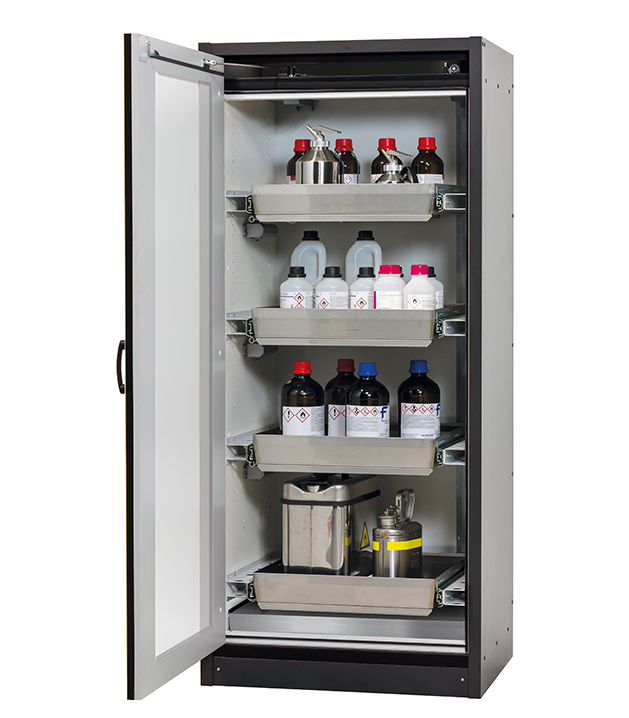 Korpusfarbe Anthrazitgrau, mit Flügeltür mit Glasausschnitt in Lichtgrau (RAL 7035), Inneneinrichtung mit 4 x Auszugswanne, 1 x Bodenauffangwanne (Edelstahl 1.4301)