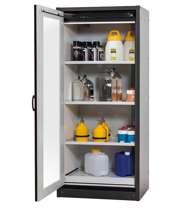 Korpusfarbe Anthrazitgrau, mit Flügeltür mit Glasausschnitt in Verkehrsrot (RAL 3020), Inneneinrichtung mit 3 x Fachboden, 1 x Lochblecheinsatz, 1 x Bodenauffangwanne (Stahlblech pulverbeschichtet)