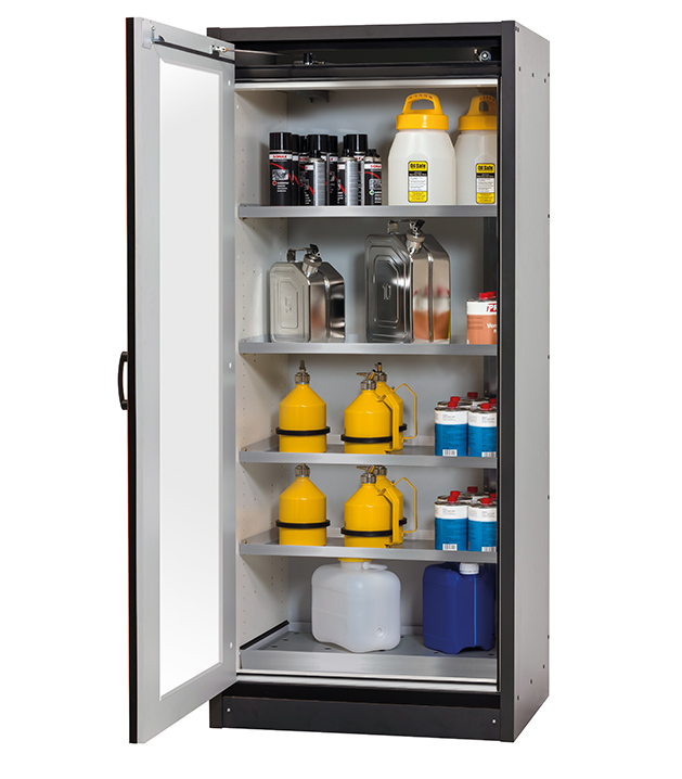 Korpusfarbe Anthrazitgrau, mit Flügeltür mit Glasausschnitt in Verkehrsrot (RAL 3020), Inneneinrichtung mit 4 x Fachboden (Edelstahl 1.4301), 1 x Lochblecheinsatz (Edelstahl 1.4016), 1 x Bodenauffangwanne (Edelstahl 1.4301)