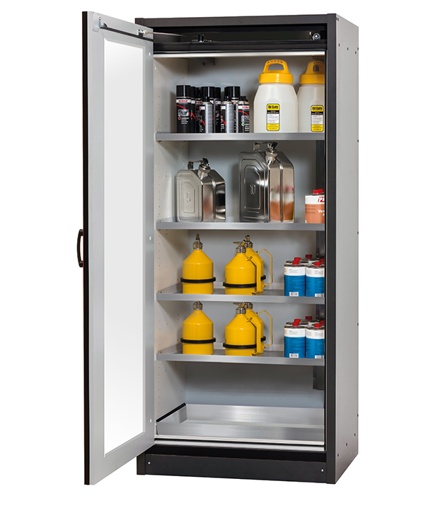 Korpusfarbe Anthrazitgrau, mit Flügeltür mit Glasausschnitt in Verkehrsrot (RAL 3020), Inneneinrichtung mit 4 x Fachboden, 1 x Bodenauffangwanne (Edelstahl 1.4301)