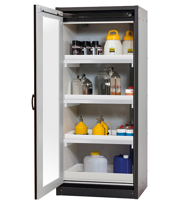 Korpusfarbe Anthrazitgrau, mit Flügeltür mit Glasausschnitt in Verkehrsrot (RAL 3020), Inneneinrichtung mit 3 x Wannenboden, 1 x Bodenauffangwanne (PP)