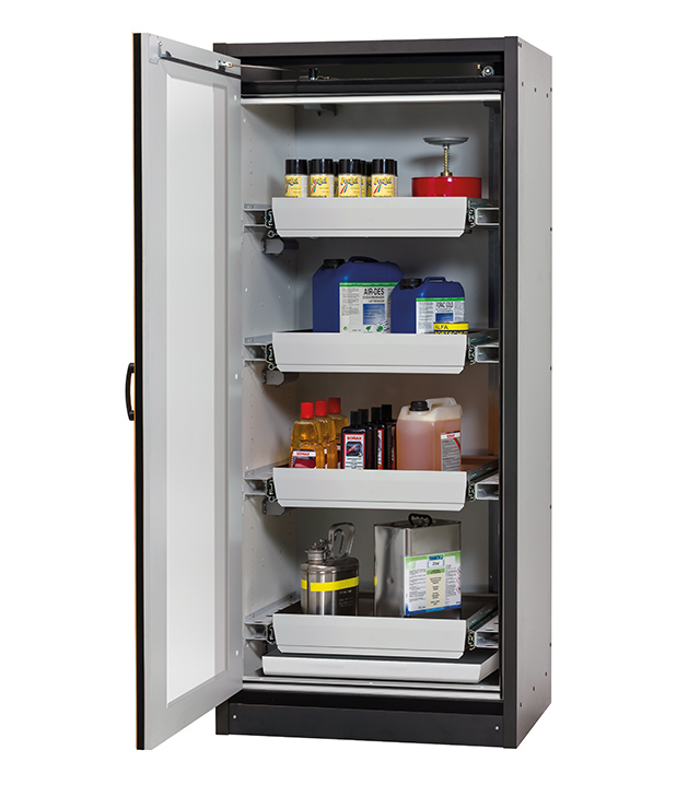Korpusfarbe Anthrazitgrau, mit Flügeltür mit Glasausschnitt in Verkehrsrot (RAL 3020), Inneneinrichtung mit 4 x Auszugswanne, 1 x Bodenauffangwanne (Stahlblech pulverbeschichtet)