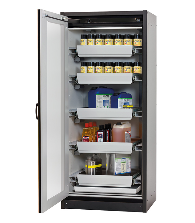 Korpusfarbe Anthrazitgrau, mit Flügeltür mit Glasausschnitt in Verkehrsrot (RAL 3020), Inneneinrichtung mit 5 x Auszugswanne, 1 x Bodenauffangwanne (Stahlblech pulverbeschichtet)