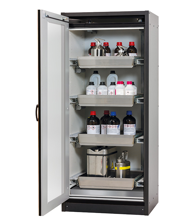 Korpusfarbe Anthrazitgrau, mit Flügeltür mit Glasausschnitt in Verkehrsrot (RAL 3020), Inneneinrichtung mit 4 x Auszugswanne, 1 x Bodenauffangwanne (Edelstahl 1.4301)
