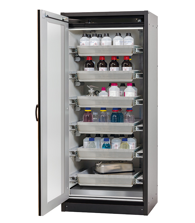 Korpusfarbe Anthrazitgrau, mit Flügeltür mit Glasausschnitt in Verkehrsrot (RAL 3020), Inneneinrichtung mit 6 x Auszugswanne, 1 x Bodenauffangwanne (Edelstahl 1.4301)