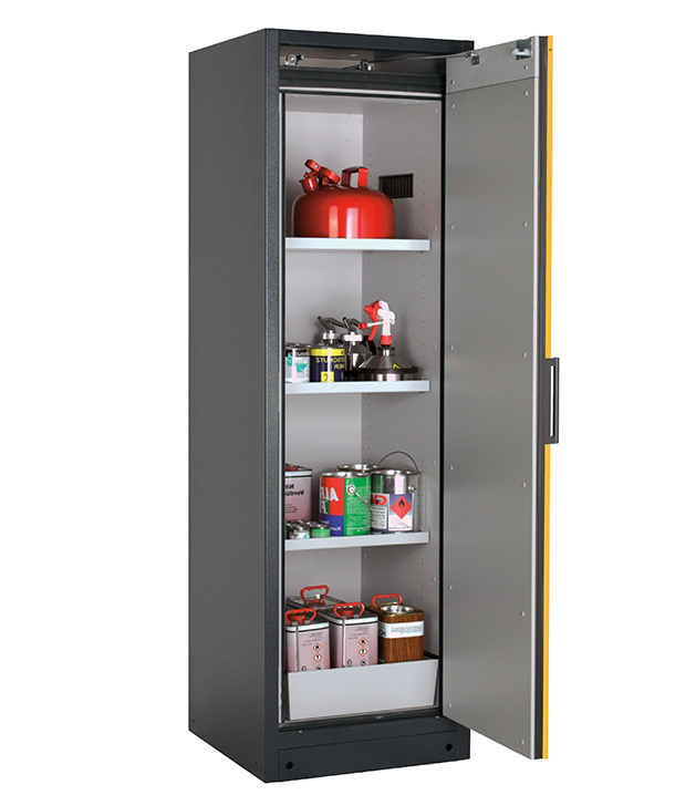 Korpusfarbe Anthrazitgrau (RAL 7016), mit Flügeltür in Sicherheitsgelb (RAL 1004), Inneneinrichtung mit 3 x Fachboden, 1 x Lochblecheinsatz, 1 x Bodenauffangwanne (Stahlblech pulverbeschichtet)