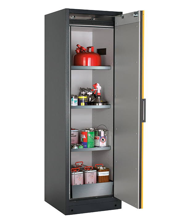 Korpusfarbe Anthrazitgrau (RAL 7016), mit Flügeltür in Sicherheitsgelb (RAL 1004), Inneneinrichtung mit 3 x Fachboden (Edelstahl 1.4301), 1 x Lochblecheinsatz, 1 x Bodenauffangwanne (Edelstahl 1.4016)