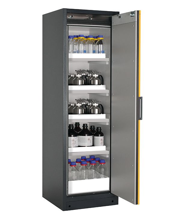 Korpusfarbe Anthrazitgrau (RAL 7016), mit Flügeltür in Sicherheitsgelb (RAL 1004), Inneneinrichtung mit 4 x Wannenboden, 1 x Bodenauffangwanne (PP)