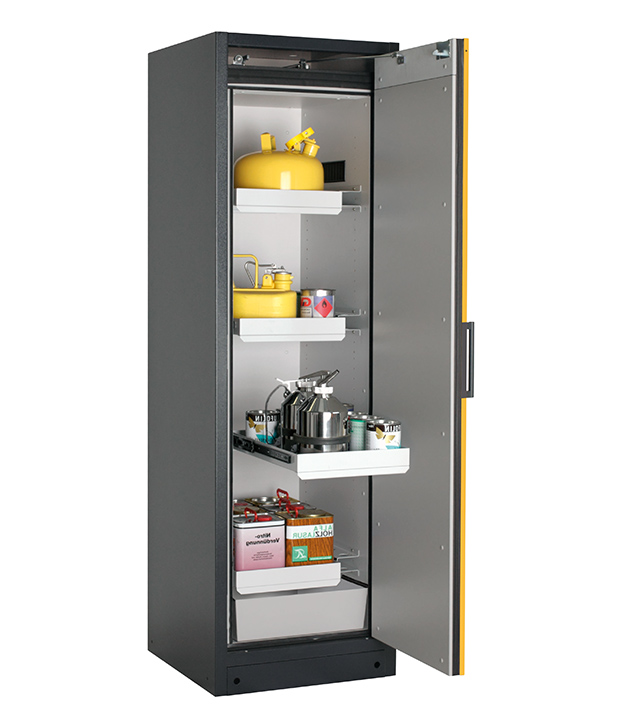 Korpusfarbe Anthrazitgrau (RAL 7016), mit Flügeltür in Sicherheitsgelb (RAL 1004), Inneneinrichtung mit 3 x Auszugswanne, 1 x Auszugswanne Entsorgung, 1 x Bodenauffangwanne (Stahlblech pulverbeschichtet)