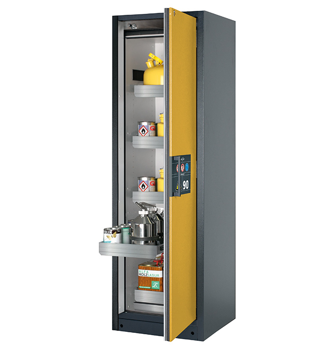 Korpusfarbe Anthrazitgrau (RAL 7016), mit Flügeltür in Sicherheitsgelb (RAL 1004), Inneneinrichtung mit 5 x Auszugswanne (Edelstahl 1.4301), 1 x Bodenauffangwanne (Edelstahl 1.4016)