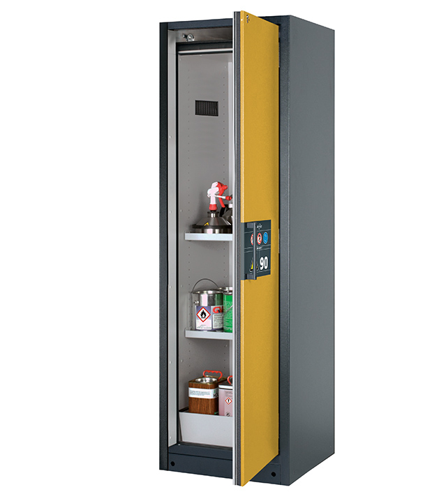 Korpusfarbe Anthrazitgrau (RAL 7016), mit Flügeltür in Sicherheitsgelb (RAL 1004), Inneneinrichtung mit 2 x Fachboden, 1 x Lochblecheinsatz, 1 x Bodenauffangwanne (Stahlblech pulverbeschichtet)