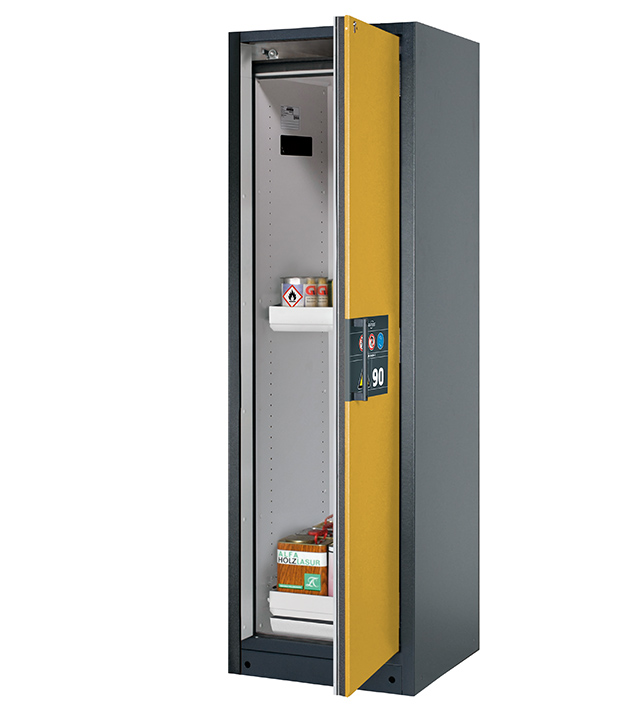 Korpusfarbe Anthrazitgrau (RAL 7016), mit Flügeltür in Sicherheitsgelb (RAL 1004), Inneneinrichtung mit 2 x Auszugswanne, 1 x Bodenauffangwanne (Stahlblech pulverbeschichtet)