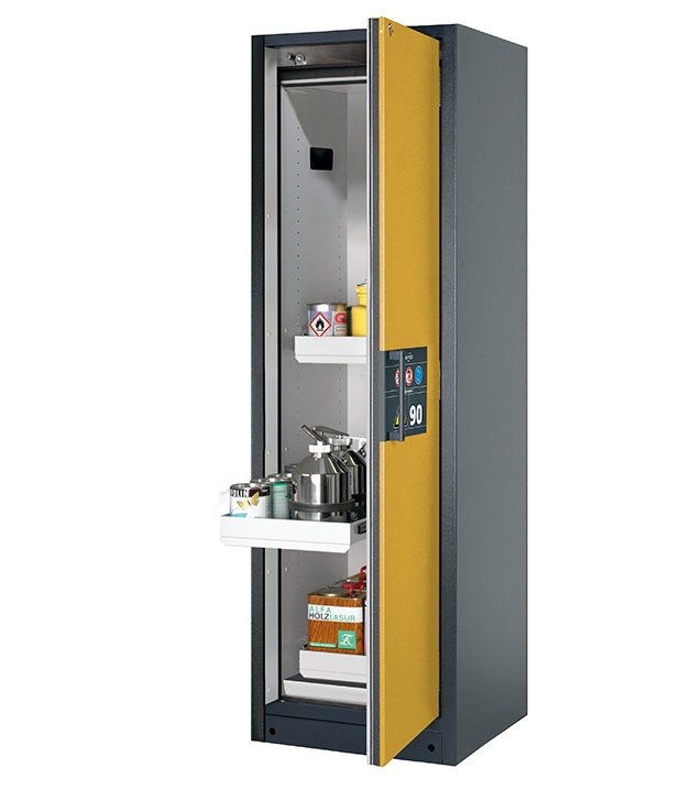 Korpusfarbe Anthrazitgrau (RAL 7016), mit Flügeltür in Sicherheitsgelb (RAL 1004), Inneneinrichtung mit 3 x Auszugswanne, 1 x Bodenauffangwanne (Stahlblech pulverbeschichtet)