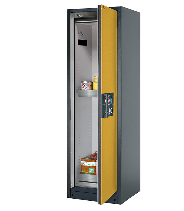 Korpusfarbe Anthrazitgrau (RAL 7016), mit Flügeltür in Sicherheitsgelb (RAL 1004), Inneneinrichtung mit 2 x Auszugswanne (Edelstahl 1.4301), 1 x Bodenauffangwanne (Edelstahl 1.4016)