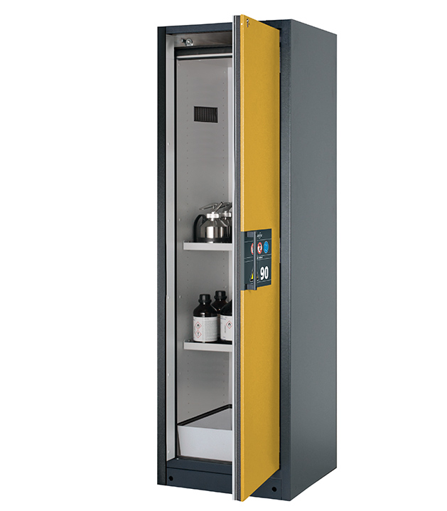 Korpusfarbe Anthrazitgrau (RAL 7016), mit Flügeltür in Sicherheitsgelb (RAL 1004), Inneneinrichtung mit 2 x Fachboden, 1 x Bodenauffangwanne (Stahlblech pulverbeschichtet)