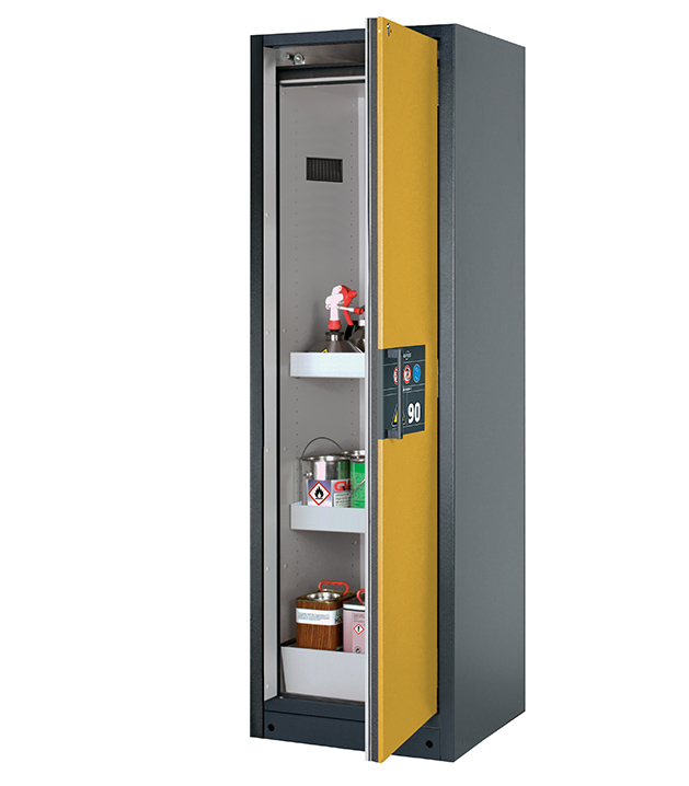 Korpusfarbe Anthrazitgrau (RAL 7016), mit Flügeltür in Sicherheitsgelb (RAL 1004), Inneneinrichtung mit 2 x Wannenboden, 1 x Lochblecheinsatz, 1 x Bodenauffangwanne (Stahlblech pulverbeschichtet)