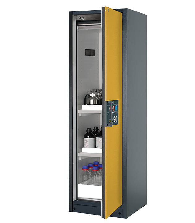 Korpusfarbe Anthrazitgrau (RAL 7016), mit Flügeltür in Sicherheitsgelb (RAL 1004), Inneneinrichtung mit 2 x Wannenboden, 1 x Bodenauffangwanne (PP)