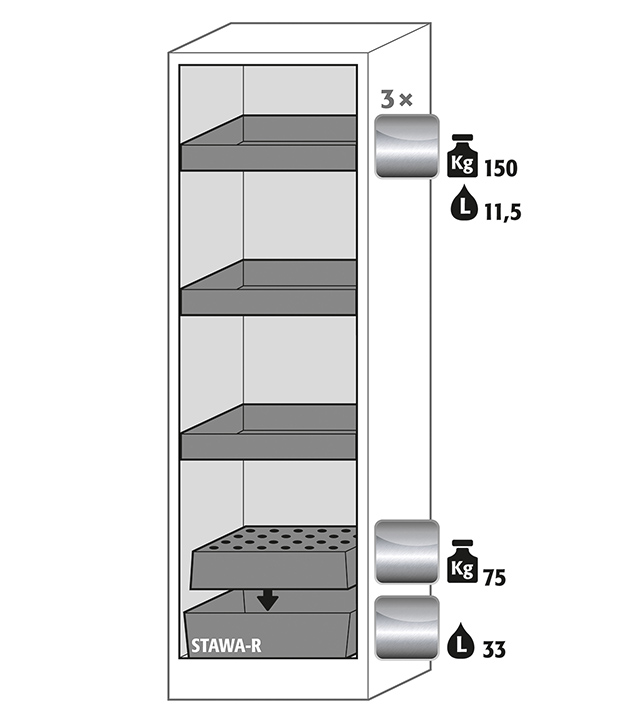 Korpusfarbe Anthrazitgrau (RAL 7016), mit Flügeltür in Lichtgrau (RAL 7035), Inneneinrichtung mit 3 x Wannenboden (Edelstahl 1.4301), 1 x Lochblecheinsatz (Edelstahl 1.4016), 1 x Bodenauffangwanne (Edelstahl 1.4301)