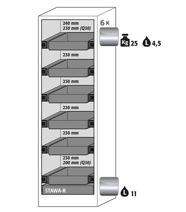 Korpusfarbe Anthrazitgrau (RAL 7016), mit Flügeltür in Lichtgrau (RAL 7035), Inneneinrichtung mit 6 x Auszugswanne (Edelstahl 1.4301), 1 x Bodenauffangwanne (Edelstahl 1.4016)