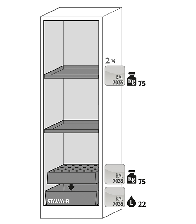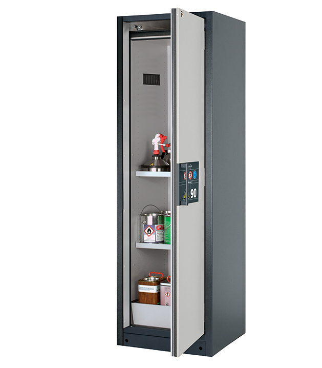 Korpusfarbe Anthrazitgrau (RAL 7016), mit Flügeltür in Lichtgrau (RAL 7035), Inneneinrichtung mit 2 x Fachboden, 1 x Lochblecheinsatz, 1 x Bodenauffangwanne (Stahlblech pulverbeschichtet)