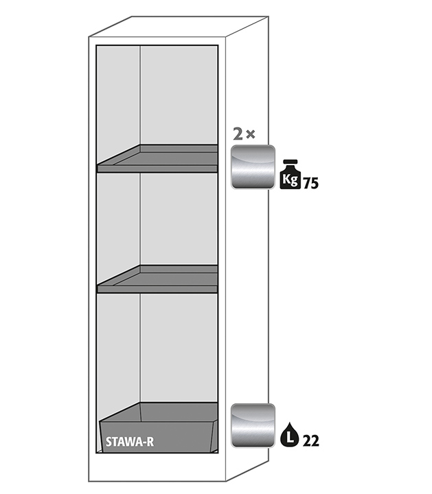 Korpusfarbe Anthrazitgrau (RAL 7016), mit Flügeltür in Lichtgrau (RAL 7035), Inneneinrichtung mit 2 x Fachboden (Edelstahl 1.4301), 1 x Bodenauffangwanne (Edelstahl 1.4016)