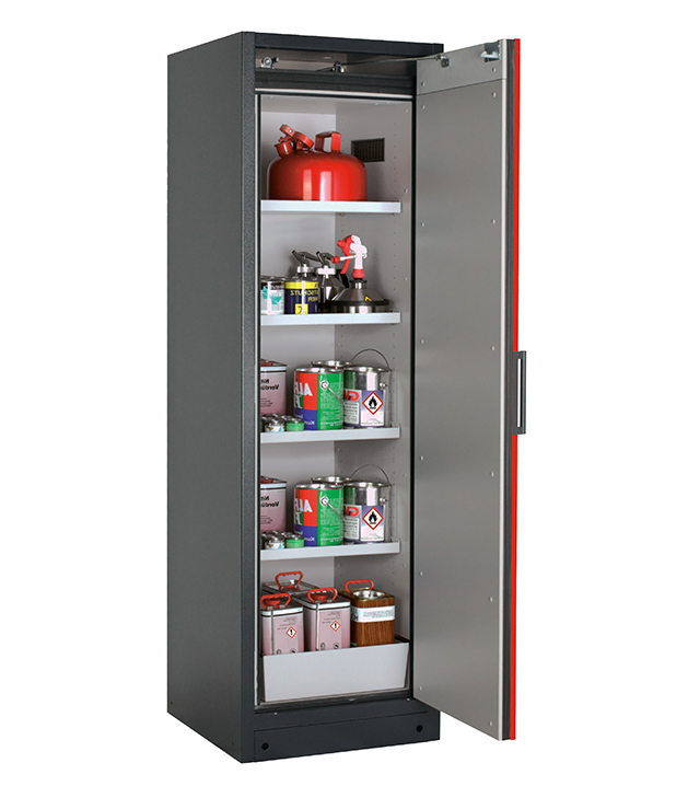 Korpusfarbe Anthrazitgrau (RAL 7016), mit Flügeltür in Verkehrsrot (RAL 3020), Inneneinrichtung mit 4 x Fachboden, 1 x Lochblecheinsatz, 1 x Bodenauffangwanne (Stahlblech pulverbeschichtet)