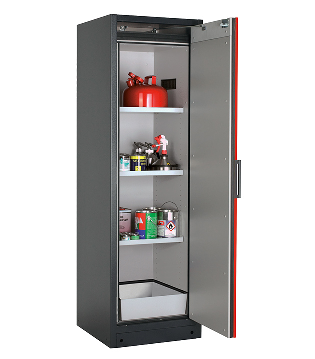 Korpusfarbe Anthrazitgrau (RAL 7016), mit Flügeltür in Verkehrsrot (RAL 3020), Inneneinrichtung mit 3 x Fachboden, 1 x Bodenauffangwanne (Stahlblech pulverbeschichtet)