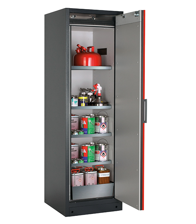Korpusfarbe Anthrazitgrau (RAL 7016), mit Flügeltür in Verkehrsrot (RAL 3020), Inneneinrichtung mit 4 x Fachboden (Edelstahl 1.4301), 1 x Lochblecheinsatz, 1 x Bodenauffangwanne (Edelstahl 1.4016)