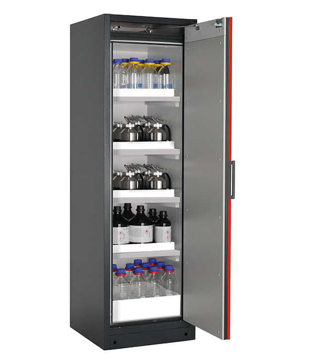 Korpusfarbe Anthrazitgrau (RAL 7016), mit Flügeltür in Verkehrsrot (RAL 3020), Inneneinrichtung mit 4 x Wannenboden, 1 x Bodenauffangwanne (PP)