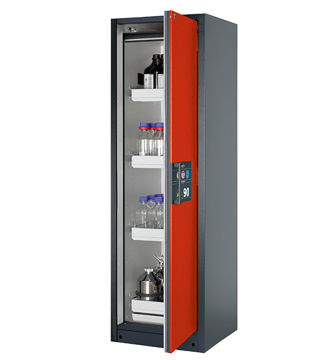 Korpusfarbe Anthrazitgrau (RAL 7016), mit Flügeltür in Verkehrsrot (RAL 3020), Inneneinrichtung mit 4 x Auszugswanne, 1 x Bodenauffangwanne (Stahlblech pulverbeschichtet)