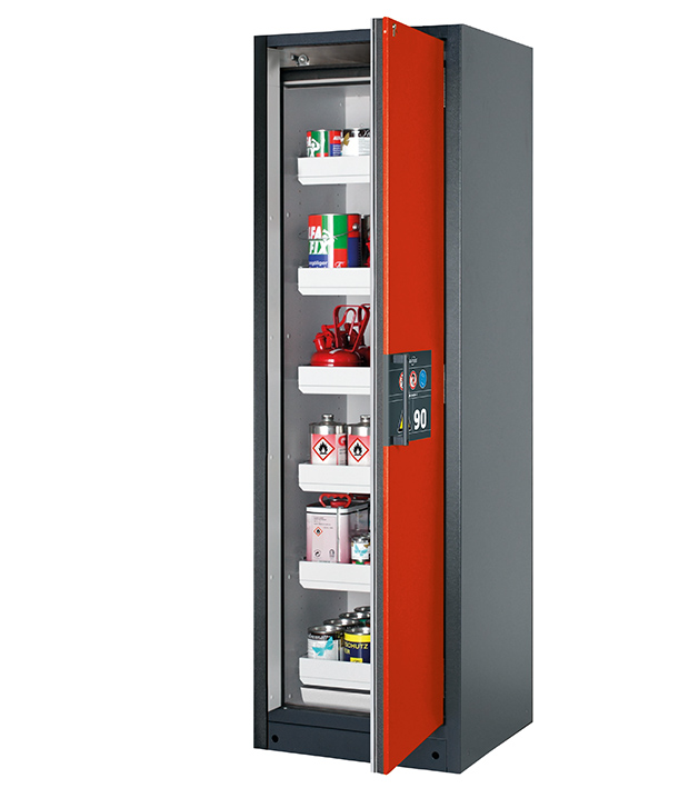 Korpusfarbe Anthrazitgrau (RAL 7016), mit Flügeltür in Verkehrsrot (RAL 3020), Inneneinrichtung mit 6 x Auszugswanne, 1 x Bodenauffangwanne (Stahlblech pulverbeschichtet)