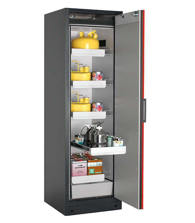 Korpusfarbe Anthrazitgrau (RAL 7016), mit Flügeltür in Verkehrsrot (RAL 3020), Inneneinrichtung mit 4 x Auszugswanne, 1 x Auszugswanne Entsorgung, 1 x Bodenauffangwanne (Stahlblech pulverbeschichtet)