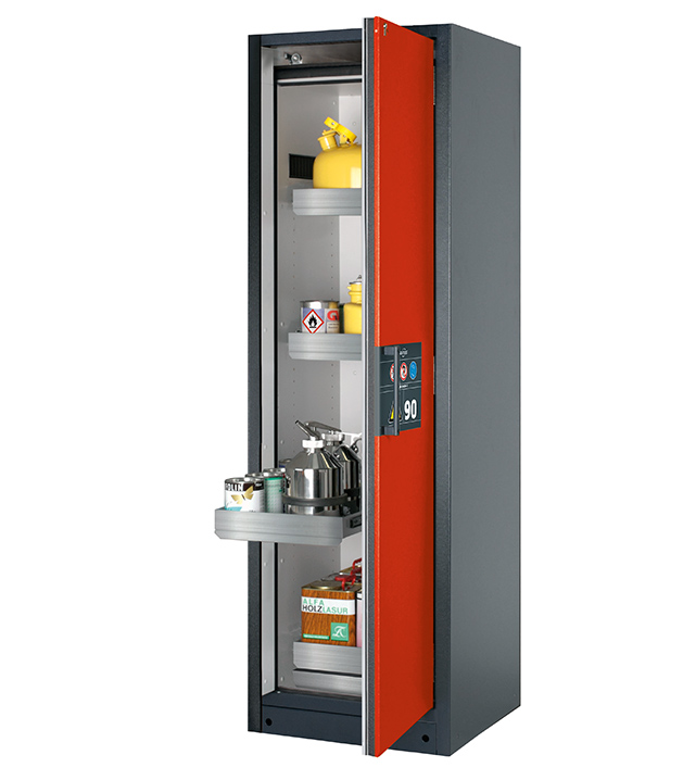 Korpusfarbe Anthrazitgrau (RAL 7016), mit Flügeltür in Verkehrsrot (RAL 3020), Inneneinrichtung mit 4 x Auszugswanne (Edelstahl 1.4301), 1 x Bodenauffangwanne (Edelstahl 1.4016)