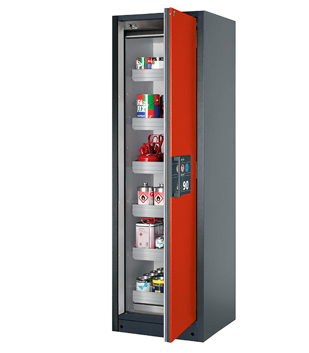 Korpusfarbe Anthrazitgrau (RAL 7016), mit Flügeltür in Verkehrsrot (RAL 3020), Inneneinrichtung mit 6 x Auszugswanne (Edelstahl 1.4301), 1 x Bodenauffangwanne (Edelstahl 1.4016)
