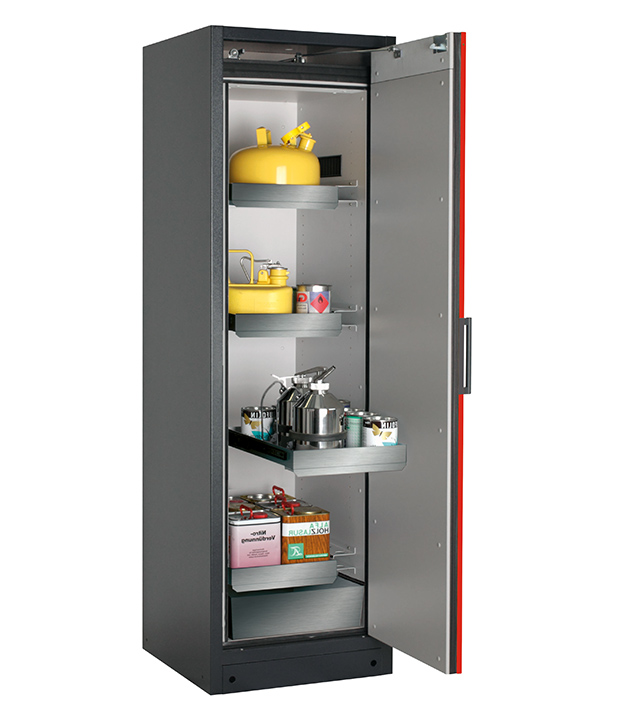 Korpusfarbe Anthrazitgrau (RAL 7016), mit Flügeltür in Verkehrsrot (RAL 3020), Inneneinrichtung mit 3 x Auszugswanne, 1 x Auszugswanne Entsorgung (Edelstahl 1.4301), 1 x Bodenauffangwanne (Edelstahl 1.4016)