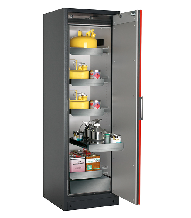 Korpusfarbe Anthrazitgrau (RAL 7016), mit Flügeltür in Verkehrsrot (RAL 3020), Inneneinrichtung mit 4 x Auszugswanne, 1 x Auszugswanne Entsorgung (Edelstahl 1.4301), 1 x Bodenauffangwanne (Edelstahl 1.4016)