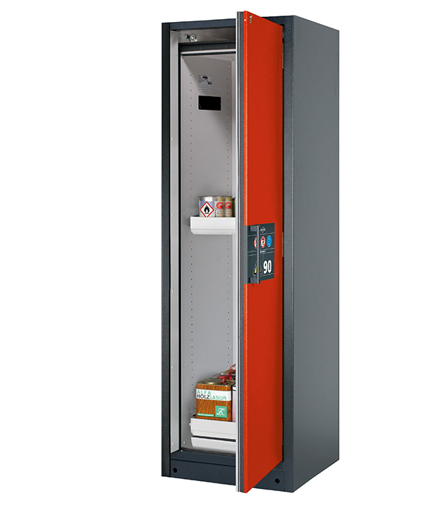 Korpusfarbe Anthrazitgrau (RAL 7016), mit Flügeltür in Verkehrsrot (RAL 3020), Inneneinrichtung mit 2 x Auszugswanne, 1 x Bodenauffangwanne (Stahlblech pulverbeschichtet)