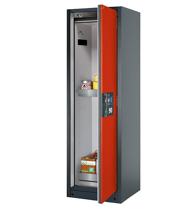 Korpusfarbe Anthrazitgrau (RAL 7016), mit Flügeltür in Verkehrsrot (RAL 3020), Inneneinrichtung mit 2 x Auszugswanne (Edelstahl 1.4301), 1 x Bodenauffangwanne (Edelstahl 1.4016)